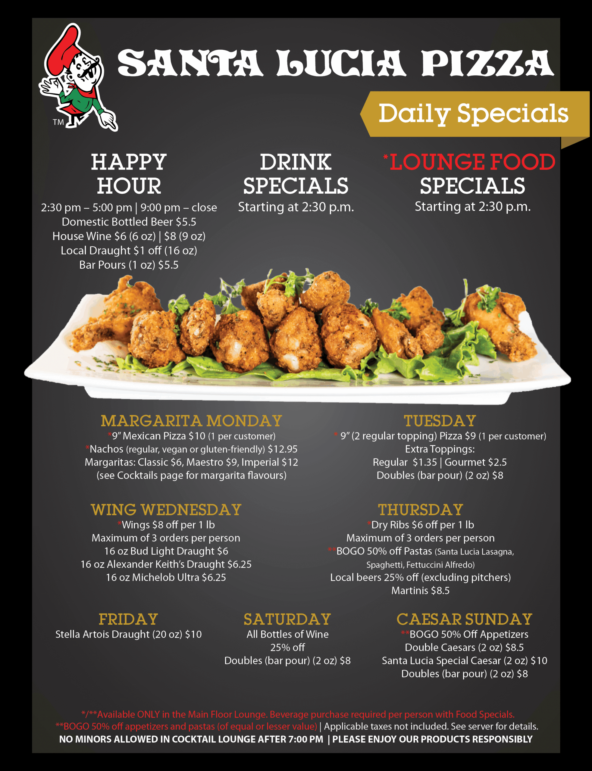 1 pound of meaty, bone-in chicken wings fried then tossed in your choice of sauce or rub (hot, BBQ, honey garlic, electric honey, salt & pepper, spicy Caesar, pineapple curry, sweet chilli, suicide, Cajun spiced).